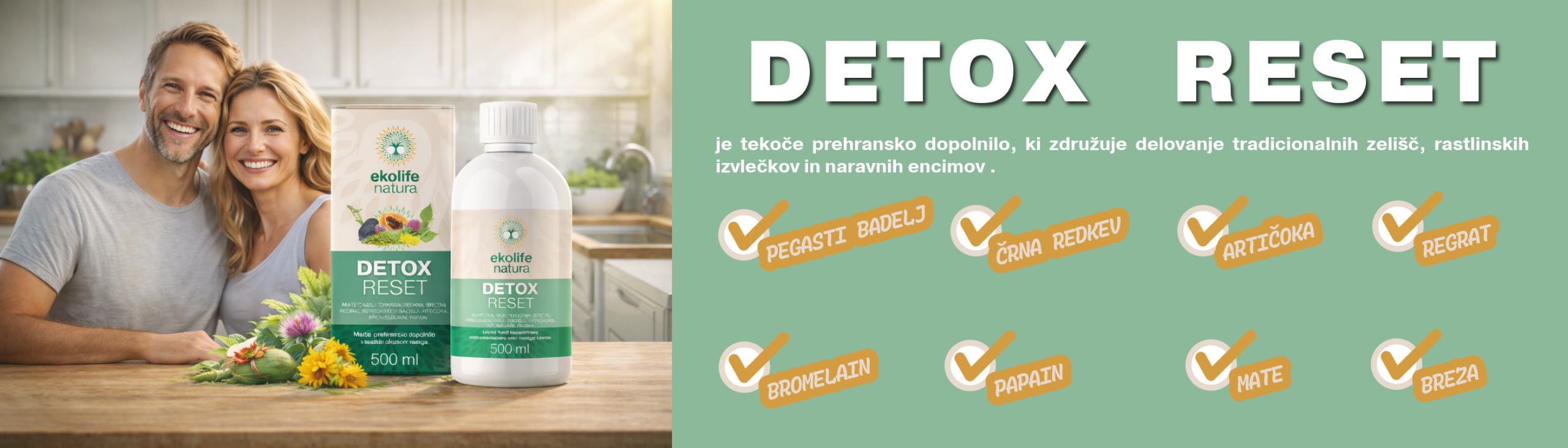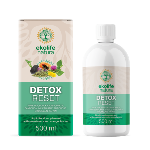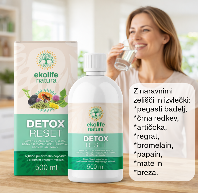 Detox Reset je tekoče prehransko dopolnilo z rastlinskimi izvlečki in naravnimi encimi, zasnovano za podporo normalnemu delovanju jeter, prebave in presnovnih procesov ter nadzoru telesne teže.
